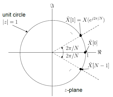 즉, x̄[k]는 단위원의 N개의 같은 간격 점, 즉 1, e^(j2π/N), ... , e^(j2(N-1)π/N)에서 계산된 X(z)와 같다.