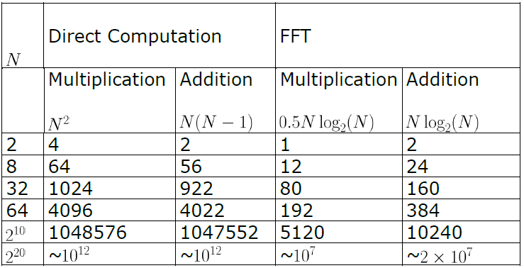 N = 2^v라고 가정하면 FFT에 해당하는 계산 요구 사항은 0.5Nlog2(N) 복소 곱셈과 Nlog2(N) 복소 덧셈이다.