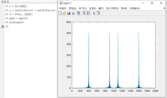 2. x[n]을 DFT를 이용하여 스펙트럼(주파수)을 확인하세요.