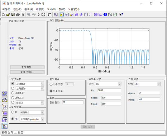 (1) filterDesigner을 이용하여 FIR Low Pass Filter(샘플링 rate 3배 변환인 경우 sampling rate=3000Hz, stopband 주파수=