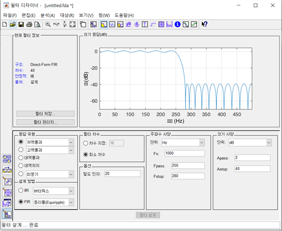 (1) filterDesigner을 이용하여 FIR Low Pass Filter(샘플링 rate 1/2배 변환인 경우 sampling rate=1000Hz, stopband 주파수=π/2= 500/2=250 Hz)를 설계하시오. (Passband frequency(250Hz), Stopband frequency 280Hz, stopband attenuation(-40dB), Passband ripple(2dB) 정도 주면 될 것입니다.)