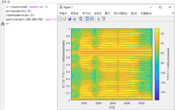 5. 원음, 샘플링 rate 변환된 신호의 spectrogram을 구하고 두 신호의 특징을 비교하시오.(spectrogram(z,256,200,256,'yaxis');