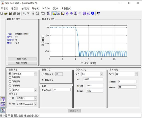 (filterDesigner을 이용하여 FIR Low Pass Filter(샘플링 rate 3/2변환인 경우 sampling rate=24,000Hz, stopband 주파수=π/3=12,000/3=4,000Hz)를 설계하시오. (Passband frequency(4000Hz), Stopband frequency 4500Hz, stopband attenuation(-40dB), Passband ripple(2dB) 정도 주면 될 것입니다.)