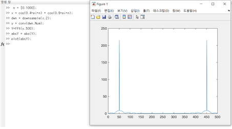 (2) x[n]을 샘플링 주파수를 500Hz(1/2배)로 변경된 신호 y[n] 만들어내시오.