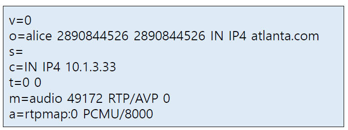 ● o=alice 2890844526 2890844526 IN IP4 atlanta.com(필수)