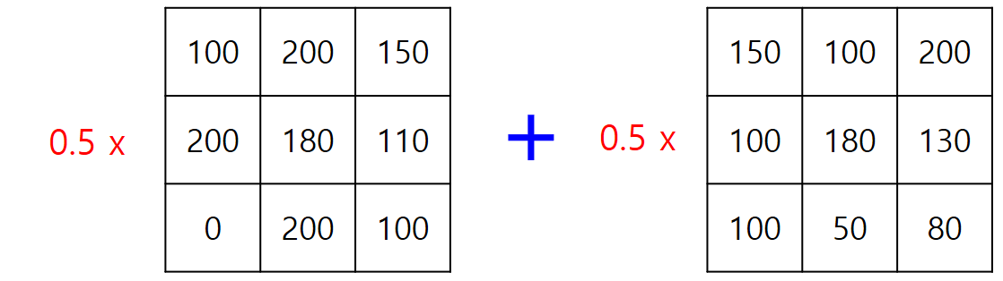 - 각 영상에 가중치를 곱하여 합하며, 가중치의 합은 일반적으로 1임