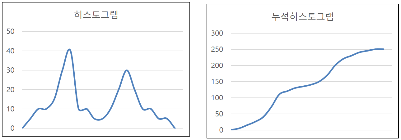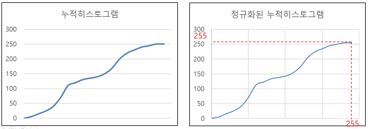 - ‘정규화된 누적히스토그램’은 ‘누적히스토그램’을 다음과 같이 정규화