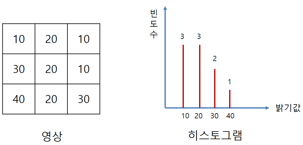 - 아래에서 밝기값 10, 20, 30, 40의 개수가 각각 3, 3, 2, 1개