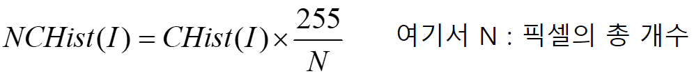 - ‘정규화된 누적히스토그램’은 ‘누적히스토그램’을 다음과 같이 정규화