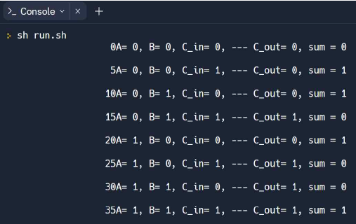 아래의 입력값과 출력된 결과값을 확인해보면 앞의 문제에서 구한 Truth Table과 동일한 것을 알 수 있다.