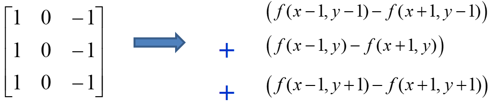 - 3개 행(y-1, y, y+1)의 x방향 기울기를 합하는 연산에 해당