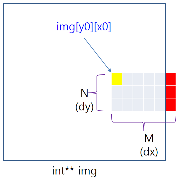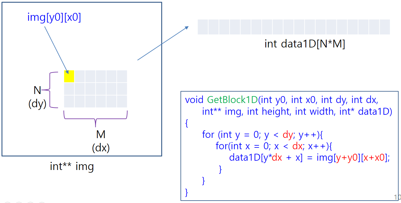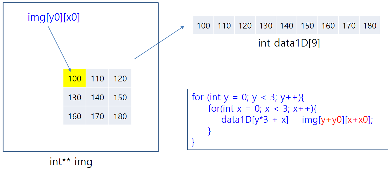 - 영상 내의 NxM 블록 데이터를 읽어 1차원 배열에 복사하기