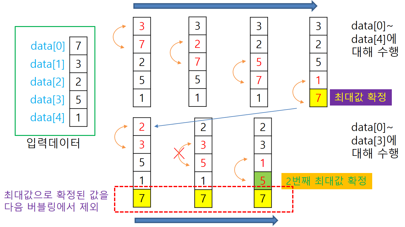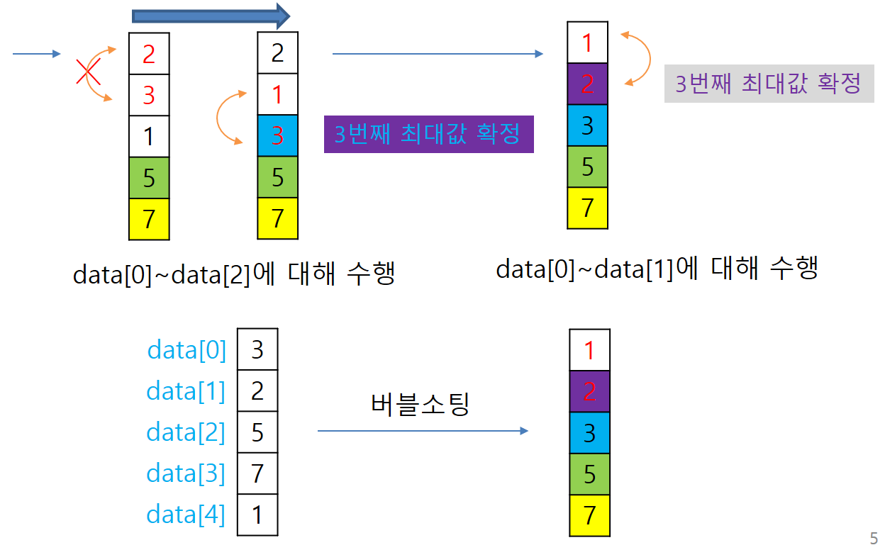 - N개 숫자 중 최대값을 구하고 가장 아랫쪽으로 위치시키기 → 바로 이웃한 값끼리 비교해서 작은 값은 윗쪽에 큰 값을 아랫쪽으로 위치를 바꿈을 반복(버블링)