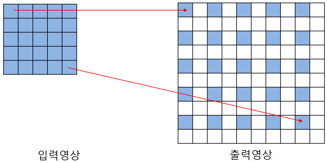 - 입력 영상의 픽셀을 출력 영상의 좌표가 짝수인 위치(파란색)에 복사
