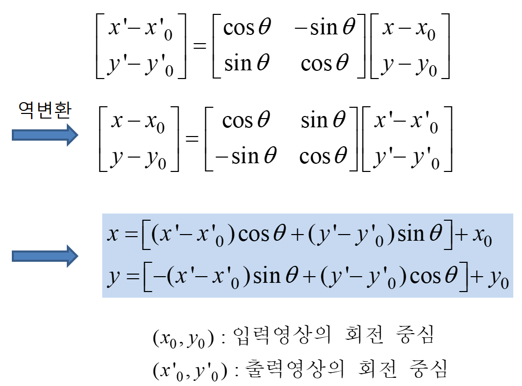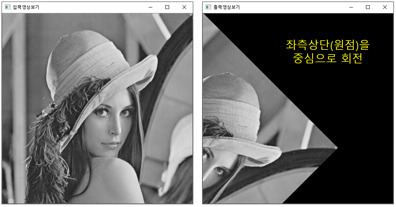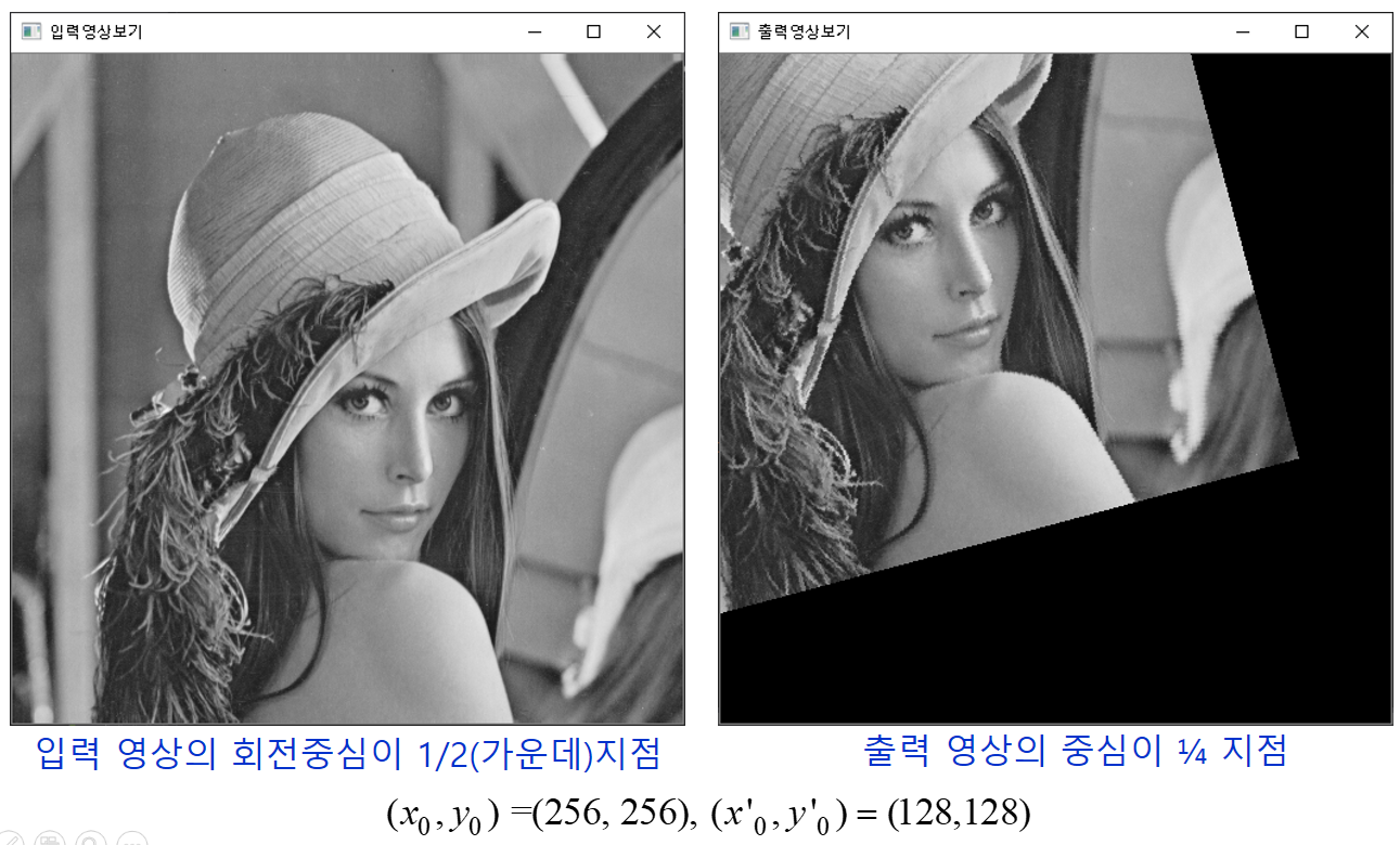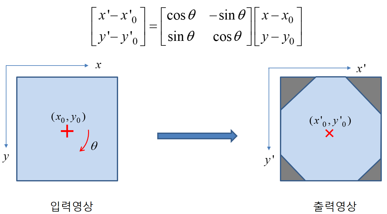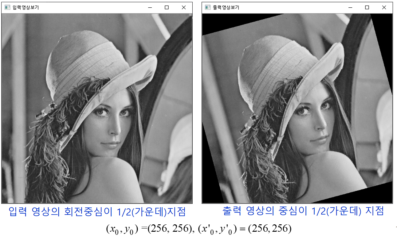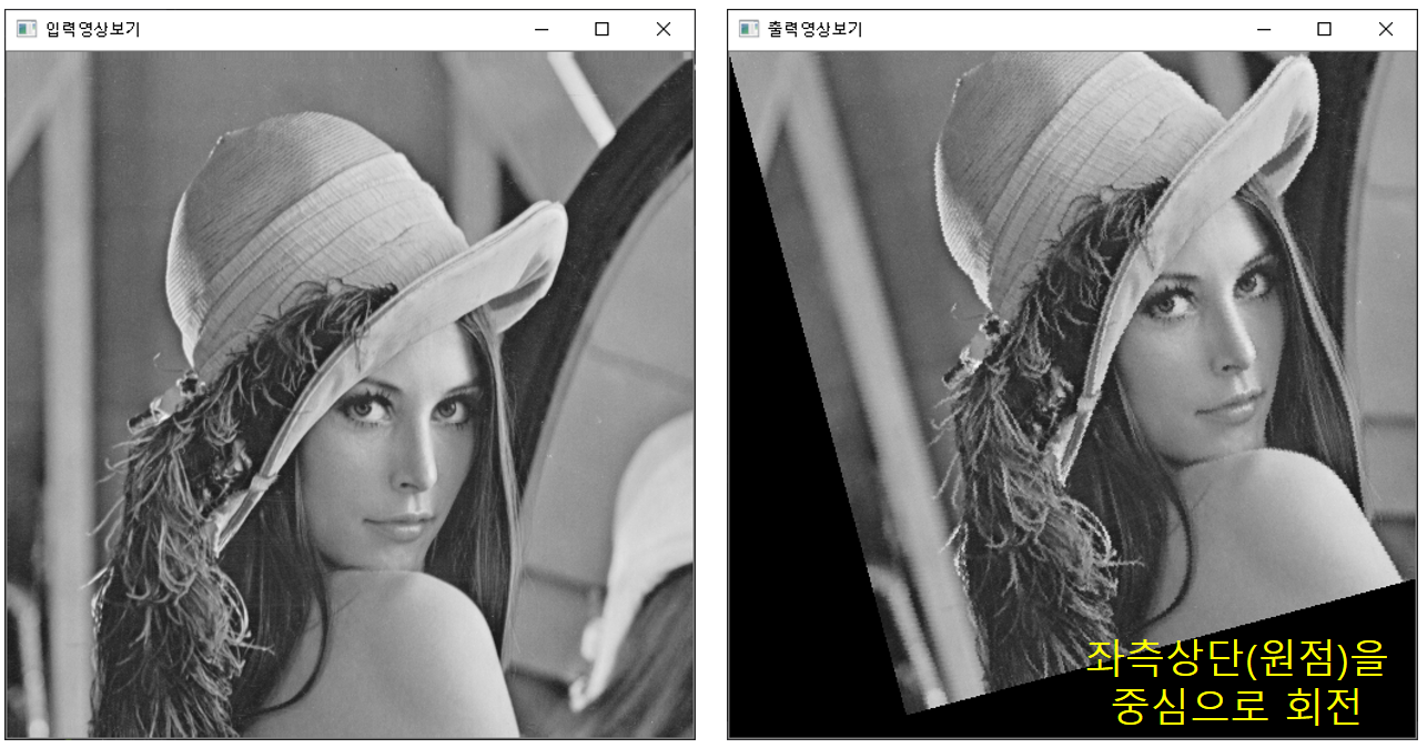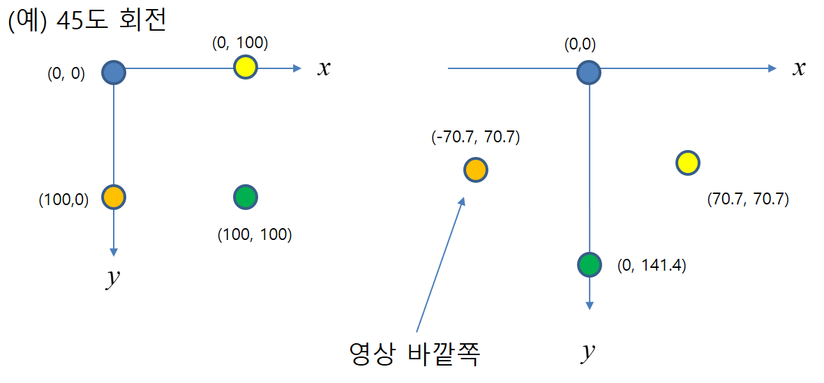 - 회전 변환 : 영상의 어떤 점을 중심으로 회전시키기