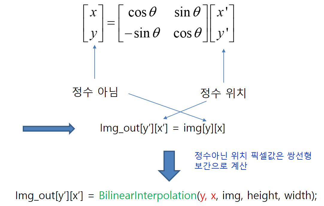 - 45도 회전에서 출력 영상의 좌표가 정수가 아님