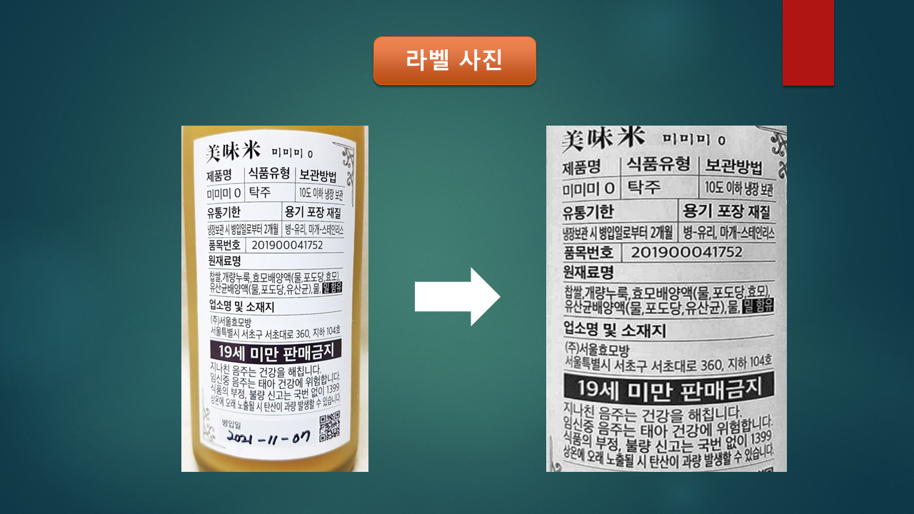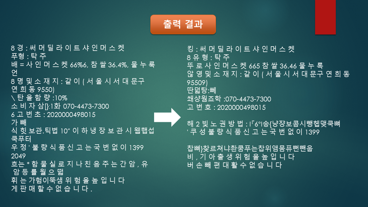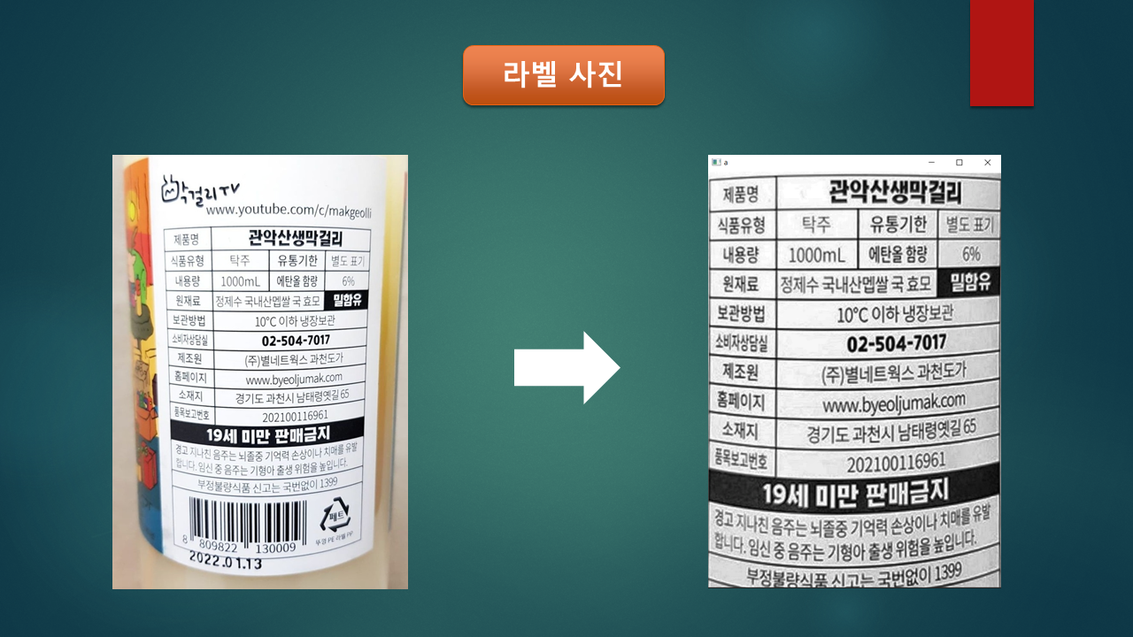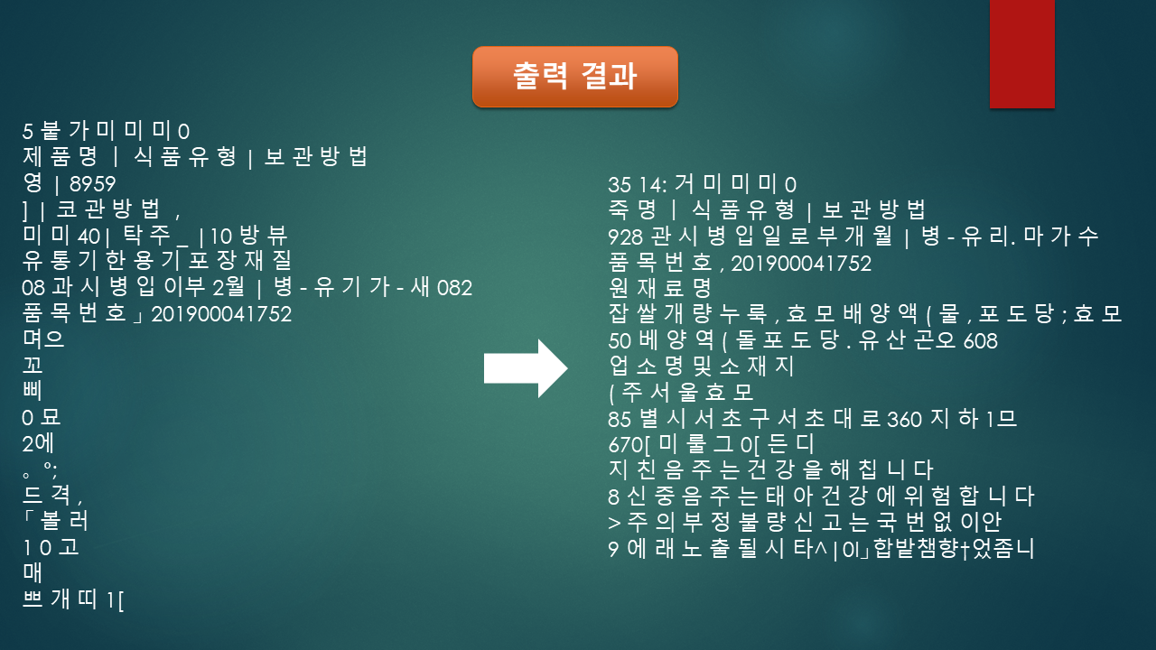 Personal Project/라벨의 제품 정보 추출 03 프로젝트 결과 및 고찰 (22.06.03) by Orangetasteboy 2023. 6. 27. 공유하기 게시글 관리 발자취 'Personal Project > 라벨의 제품 정보 추출' 카테고리의 다른 글 02 개발 중간 점검 (22.05.04) (0) 2023.06.27 01 프로젝트 소개 (22.04.06) (0) 2023.06.27 관련글 02 개발 중간 점검 (22.05.04) 01 프로젝트 소개 (22.04.06) 댓글