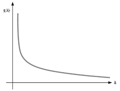 a값이 0에 가까워질수록 오차는 무한대로 커지고, 커질수록 오차는 0에 가까워짐.