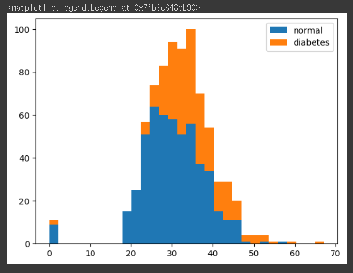 # BMI를 기준으로 각각 정상과 당뇨가 어느 비율로 분포하는지 확인
