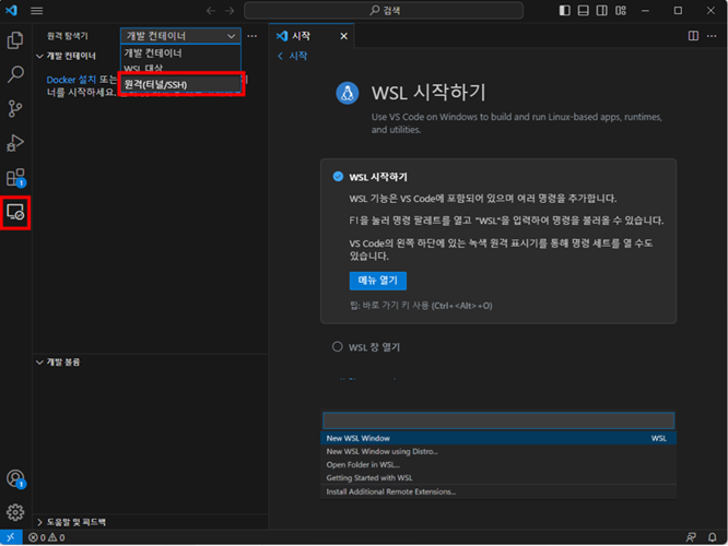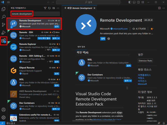 Visual Studio Code를 실행하고 좌측의 확장 아이콘을 클릭하여 “remote development”를 검색한 후, “remote development” 확장 팩을 설치한다.