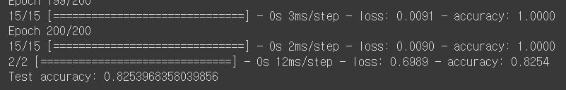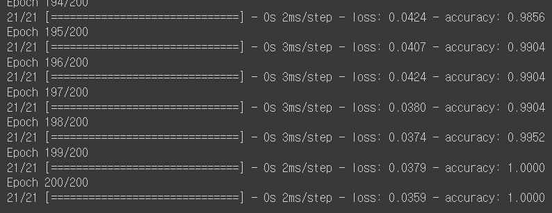 딥러닝을 실행하여 200번 반복하니 정확도가 100% 출력