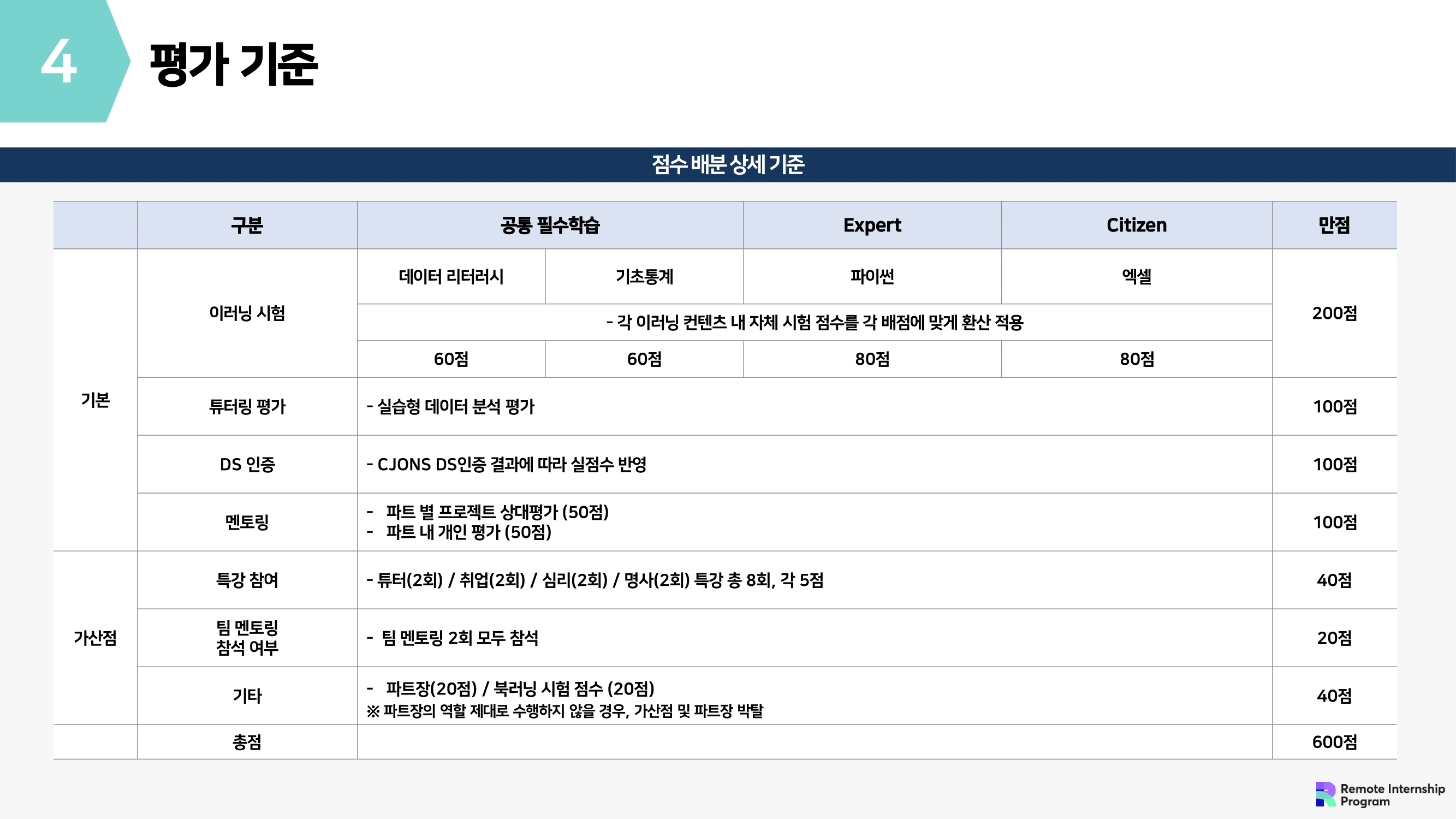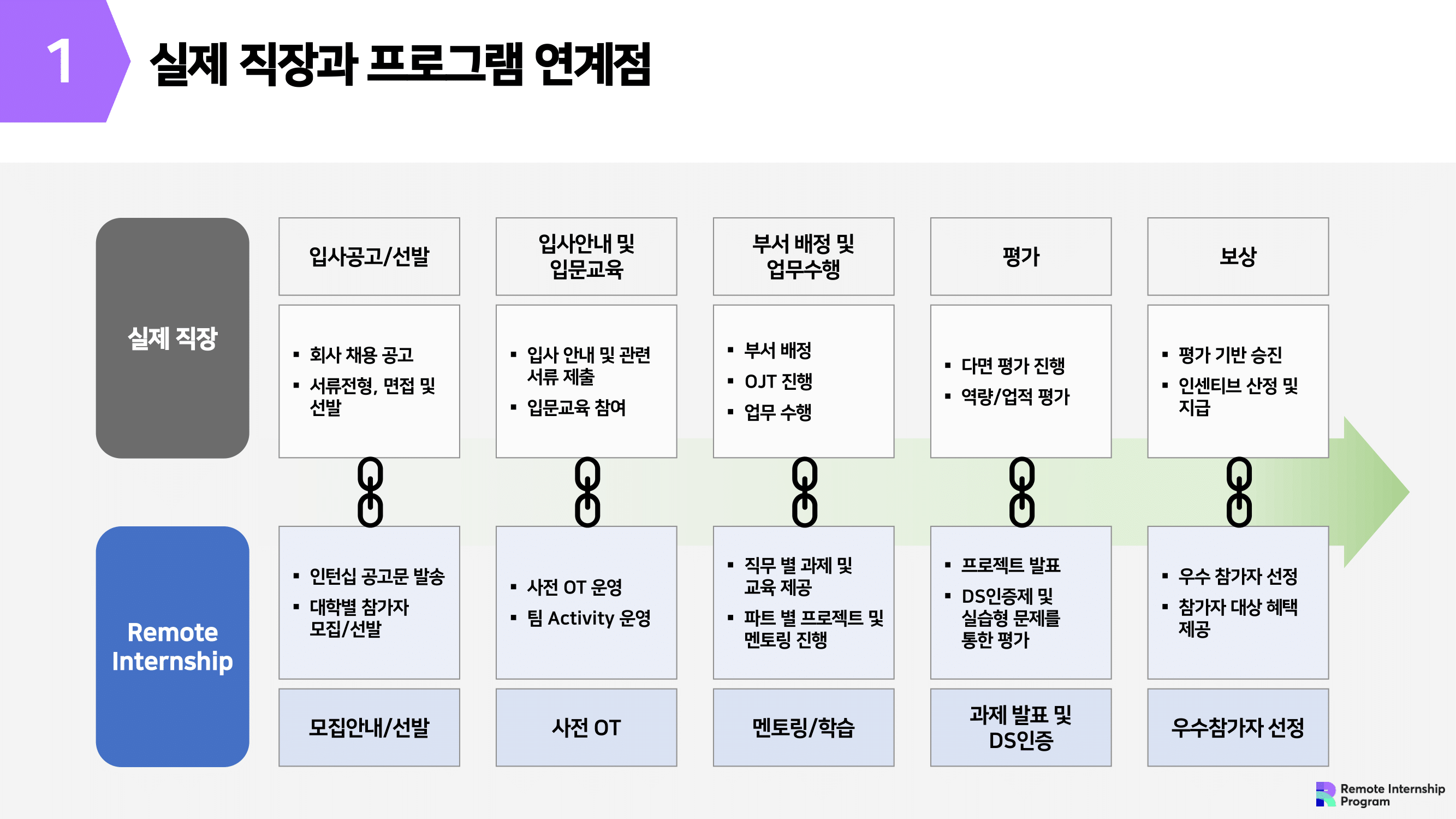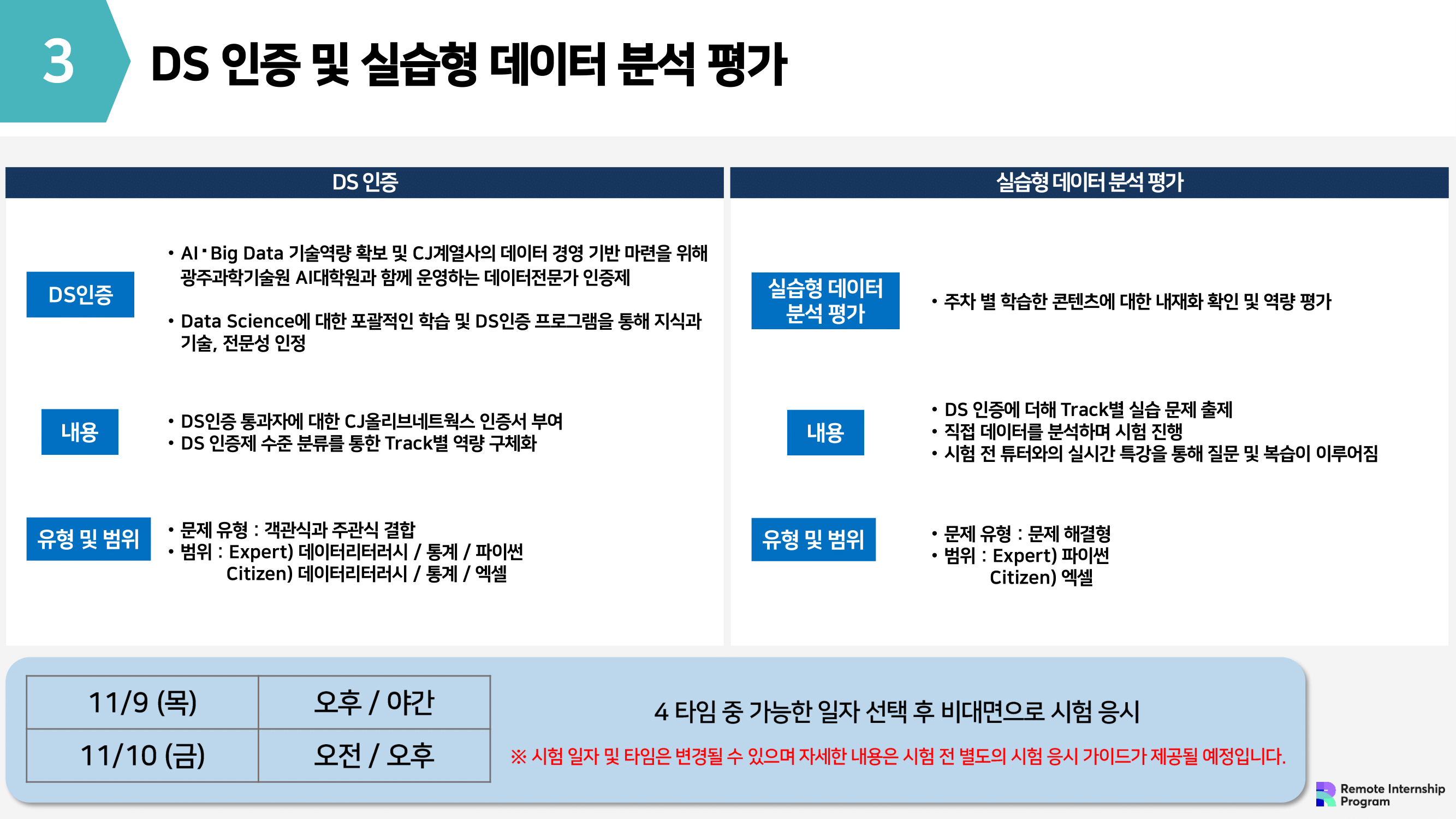 각 과정별 직무교육, 현직자멘토링, 과제발표 및 DS인증을 마치고 최종적으로 우수 인턴을 선발해서 최우수 참가자는 동계 Real Internship을 할 수 있는 기회를 준다.