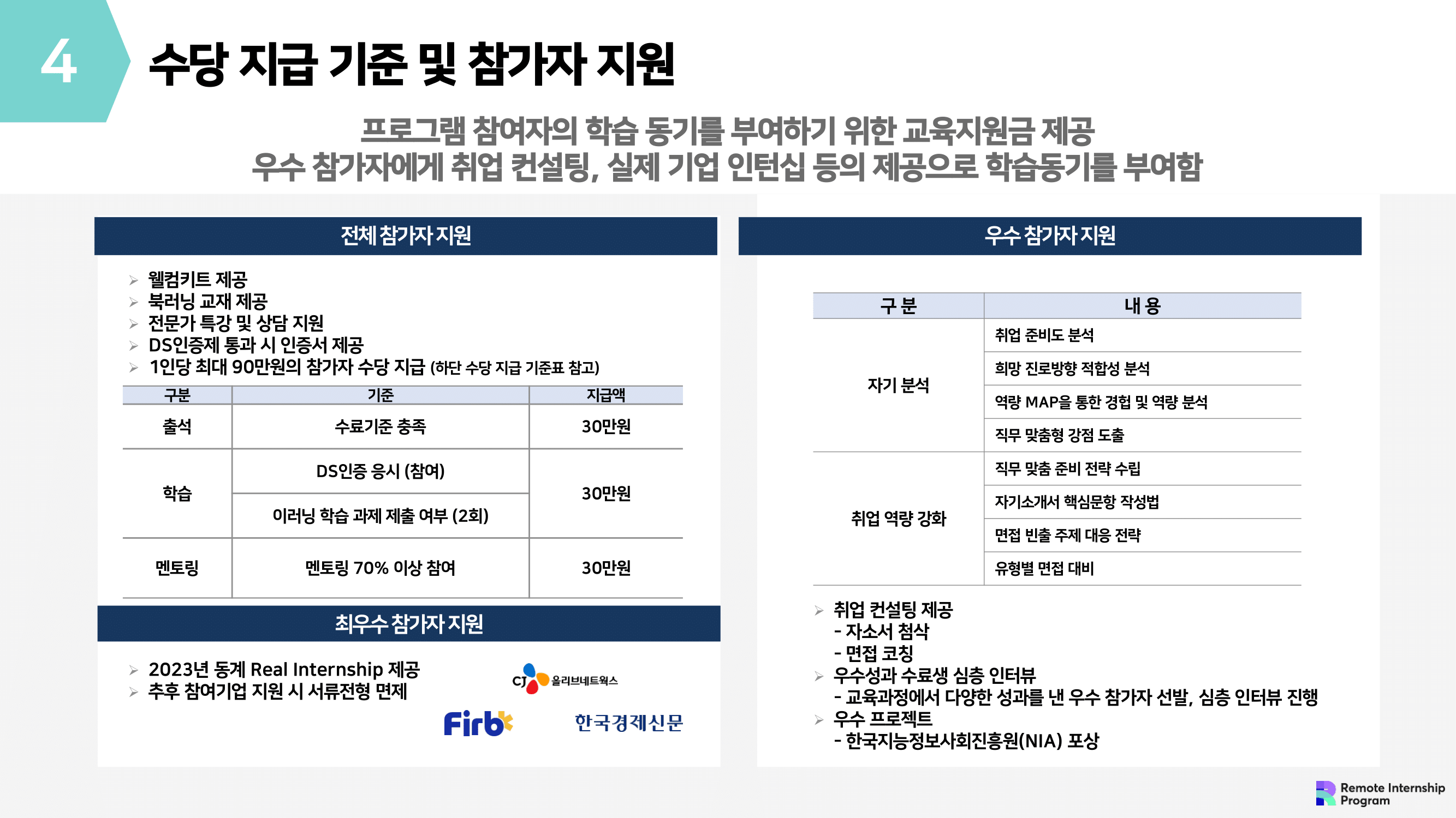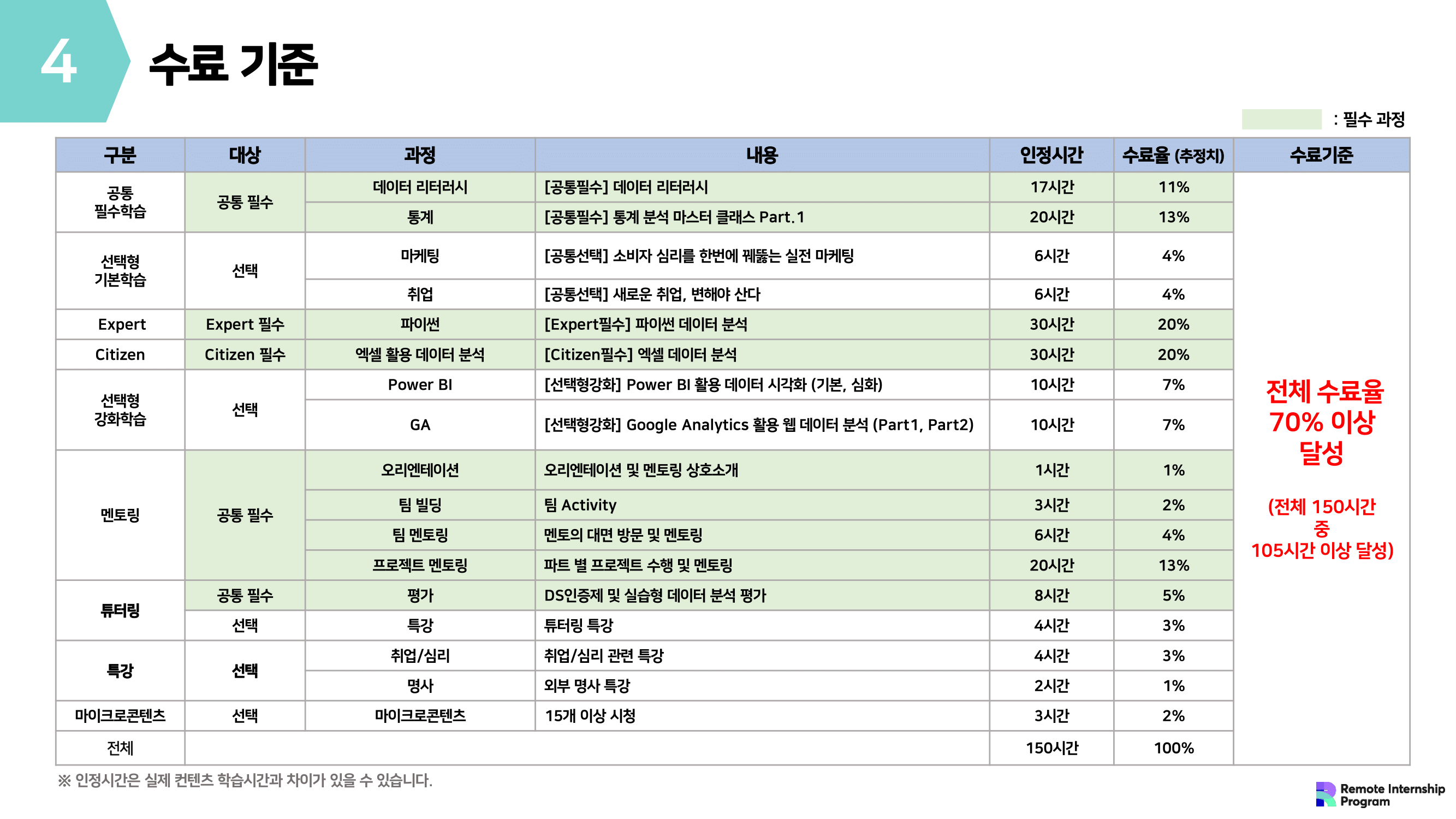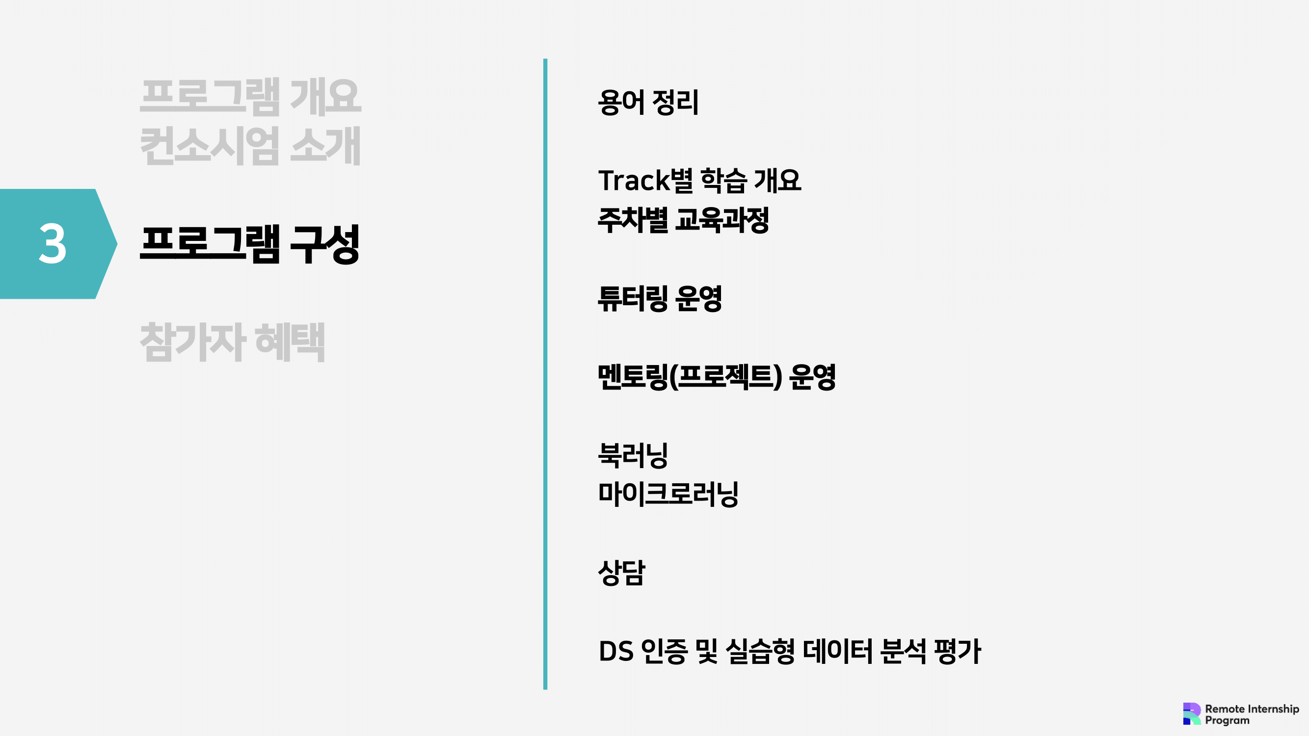 각 과정별 직무교육, 현직자멘토링, 과제발표 및 DS인증을 마치고 최종적으로 우수 인턴을 선발해서 최우수 참가자는 동계 Real Internship을 할 수 있는 기회를 준다.