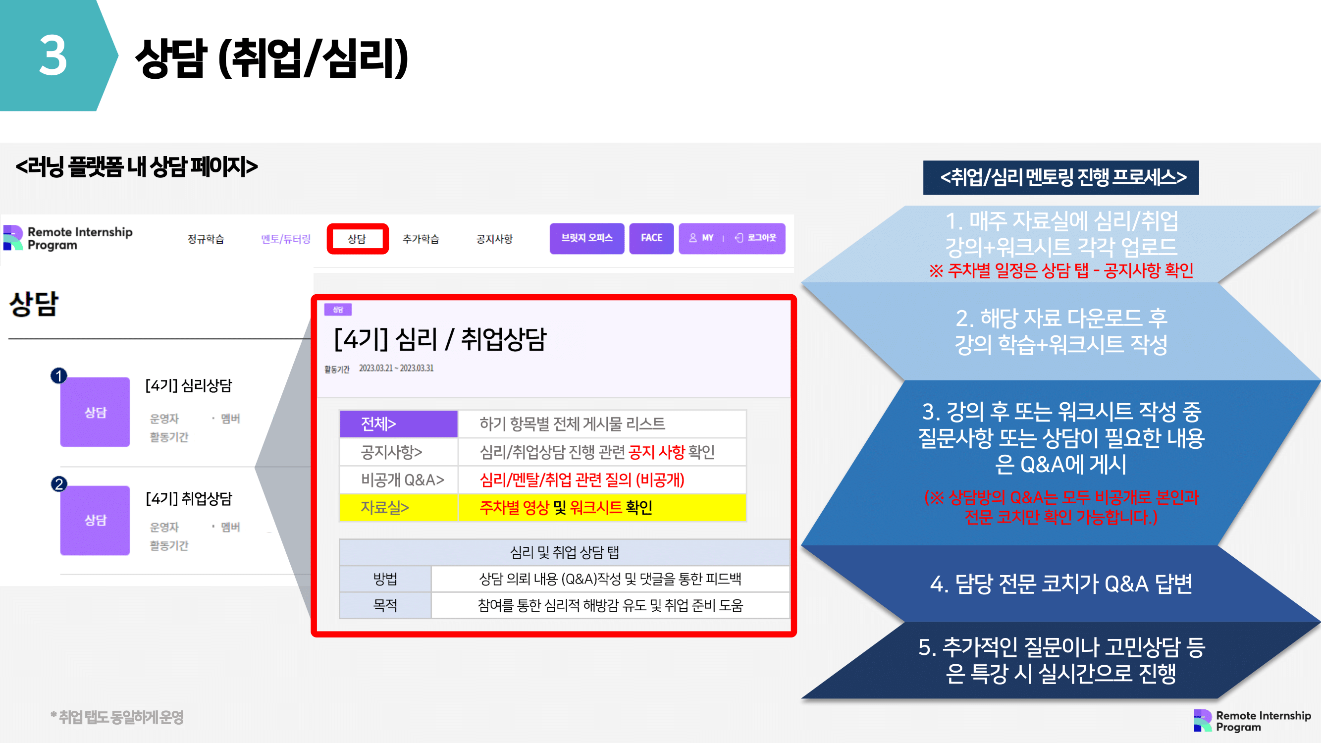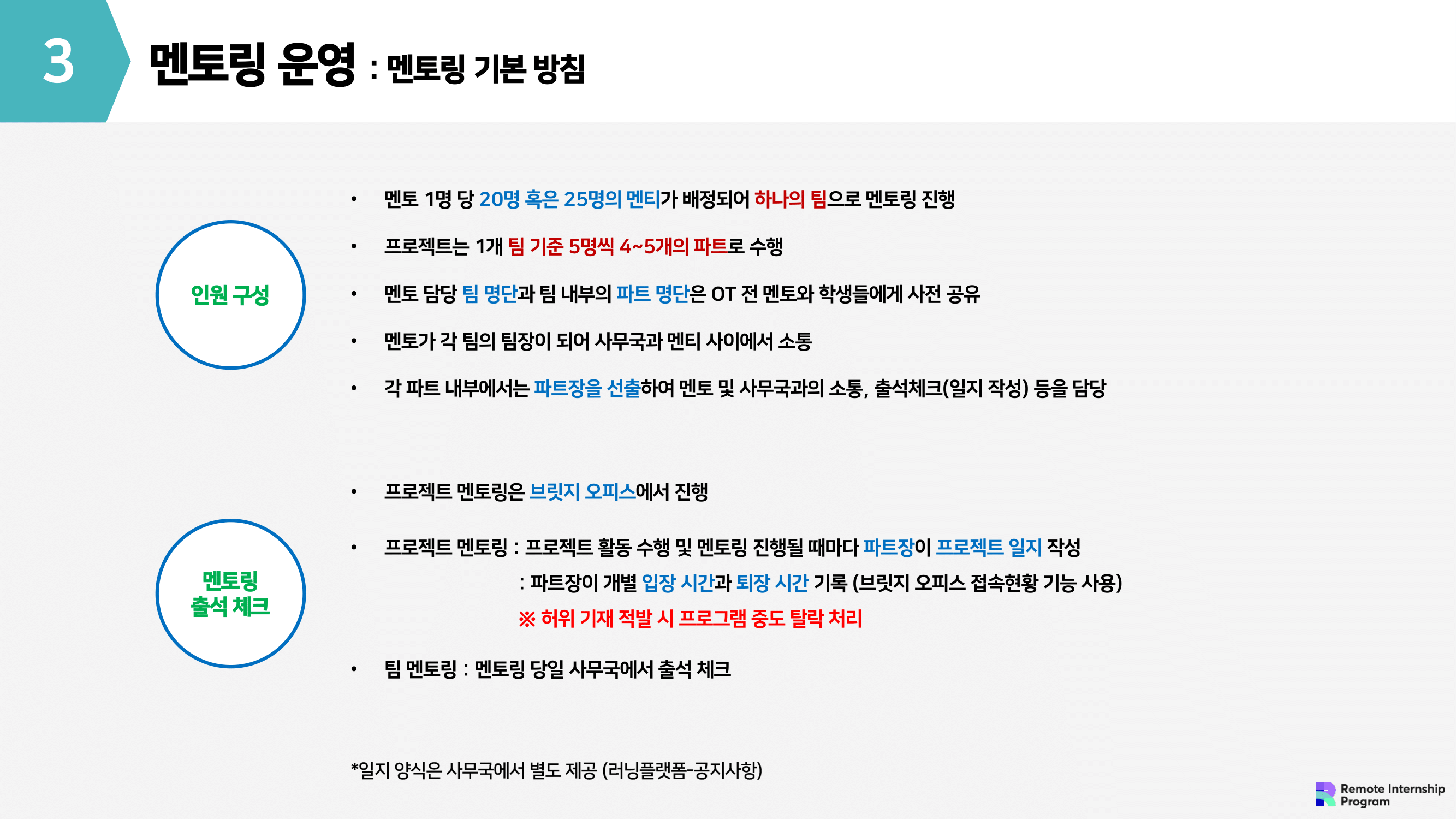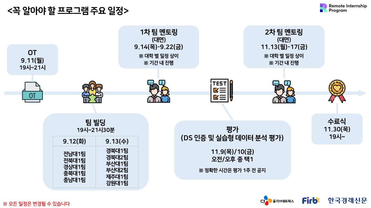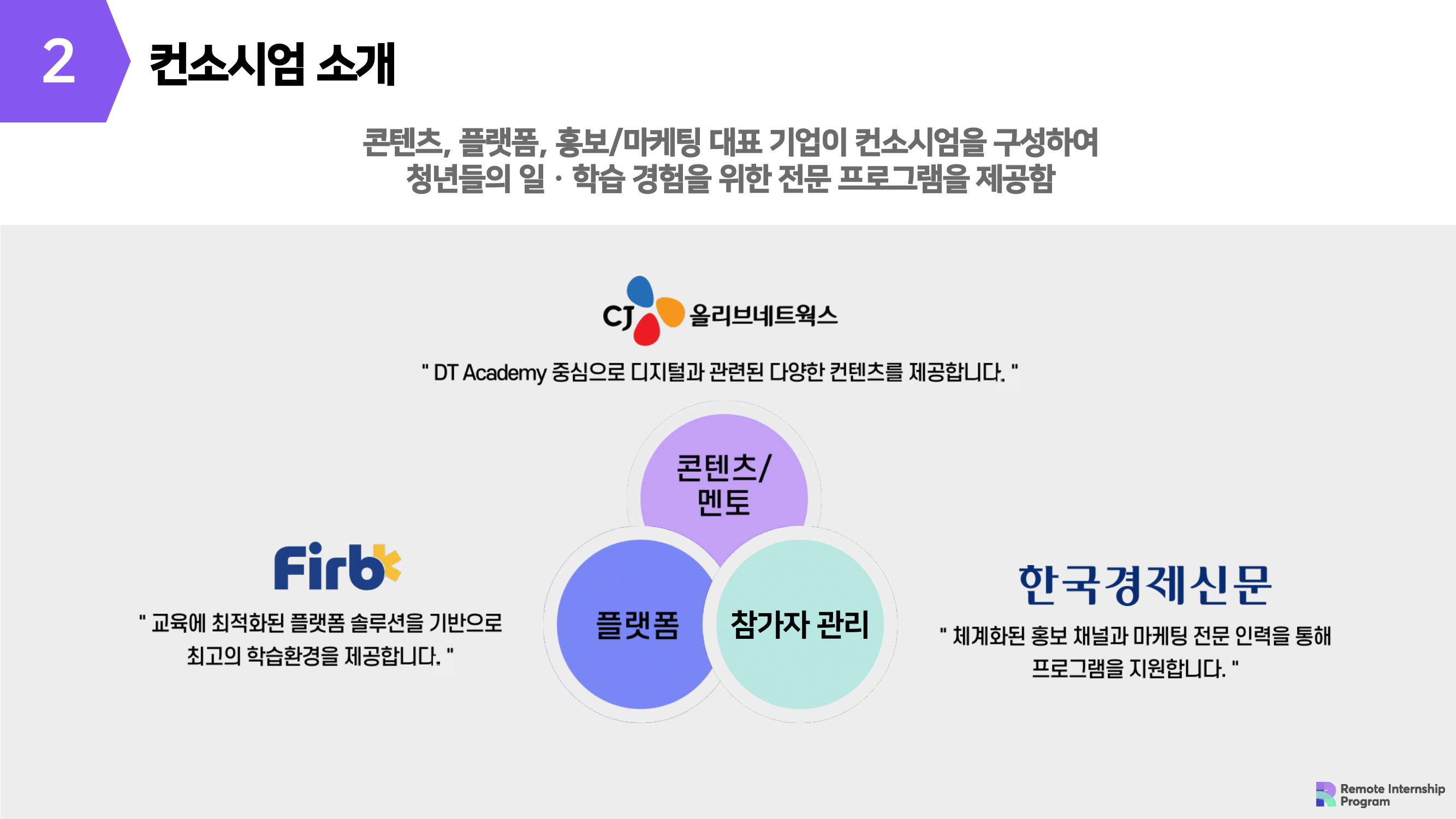 - 학교수업과 병행할 수 있는 가상공간에서의 직무교육, CJ계열사 현직자 멘토링, 팀별 과제 수행을 하는 인턴십