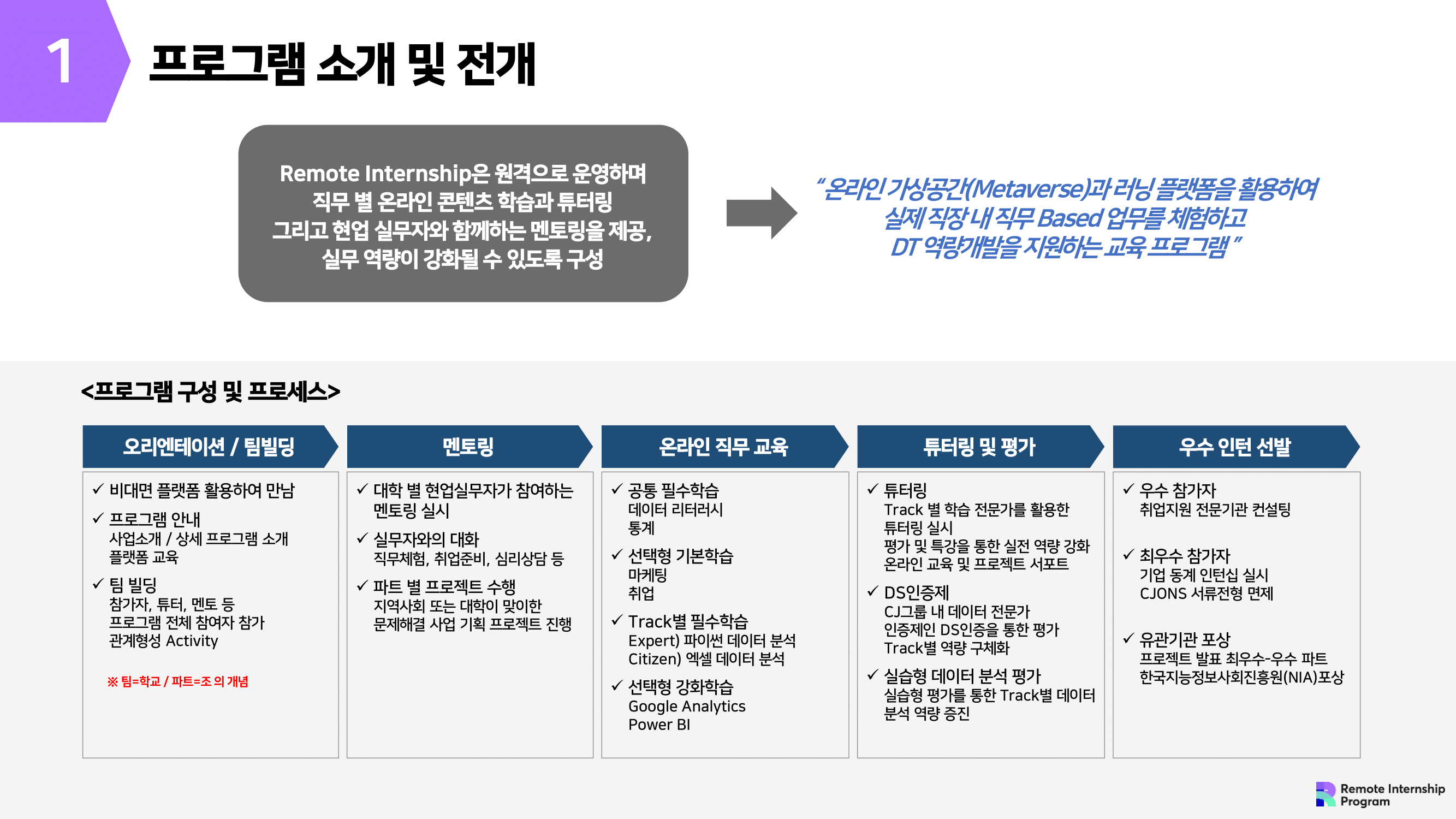 CJ Remote Internship은 온라인 가상공간(메타버스)과 교육플랫폼을 활용하여 실제 직장내 직무를 체험하고 디지털 역량개발을 지원하는 프로그램이다.
