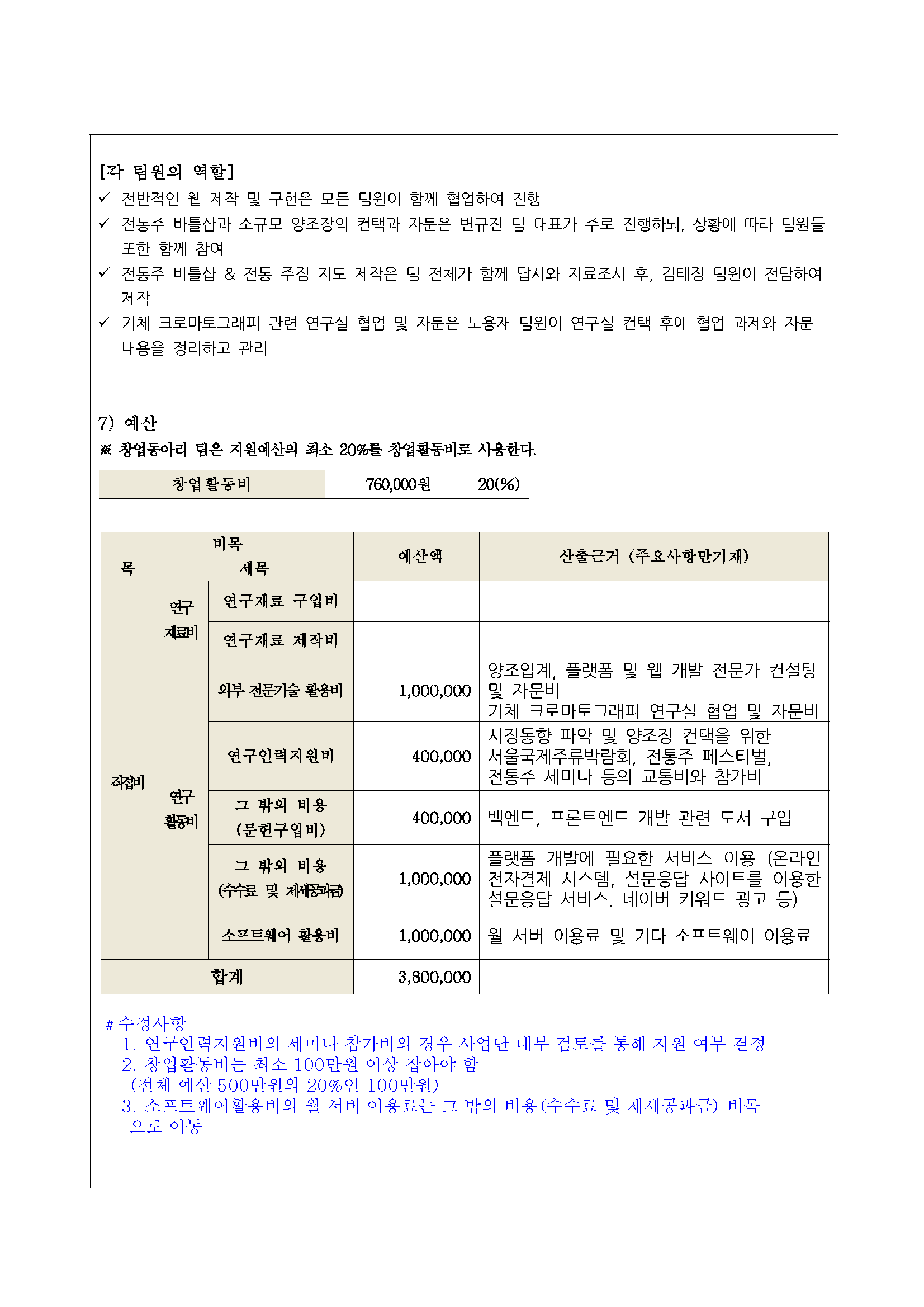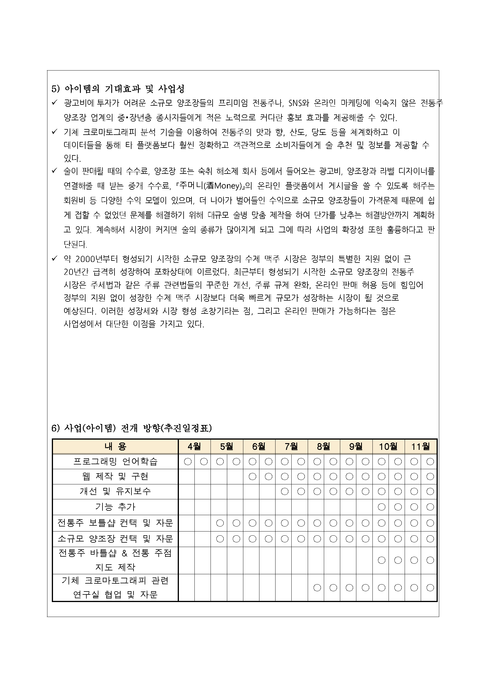 술 관련 아이템이기 때문에 팀 이름은 주머니(酒Money)로 정하고 나름대로 시장 조사와 기술 동향 등을 알아보고 지원 신청서를 열심히 작성하였다. 아이템에는 자신이 있었기 때문에 심사위원님들이 이 아이템을 진행하려는 우리 팀을 왜 뽑아야하는지 명쾌하게 받아들일 수 있도록 포커스를 맞추었다.