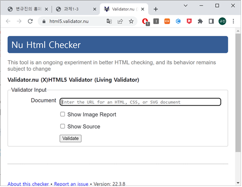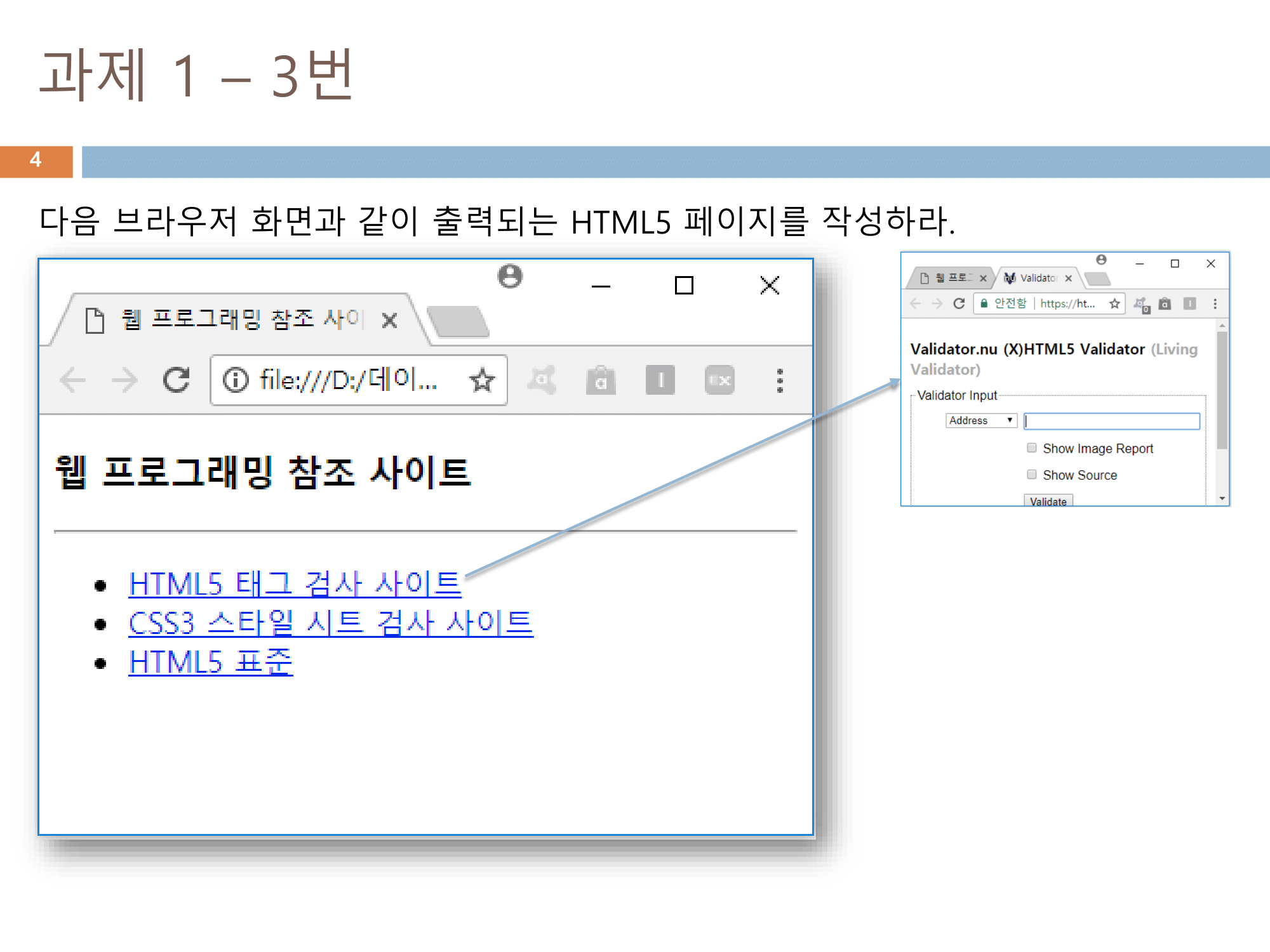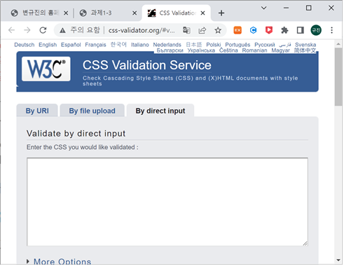 <li><a href="http://www.css-validator.org/#validate_by_input" target="_blank">CSS3 스타일 시트 검사 사이트</a></li> <!-- a 태그를 이용하여 과제 HTML 문서 링크와 연결 -->