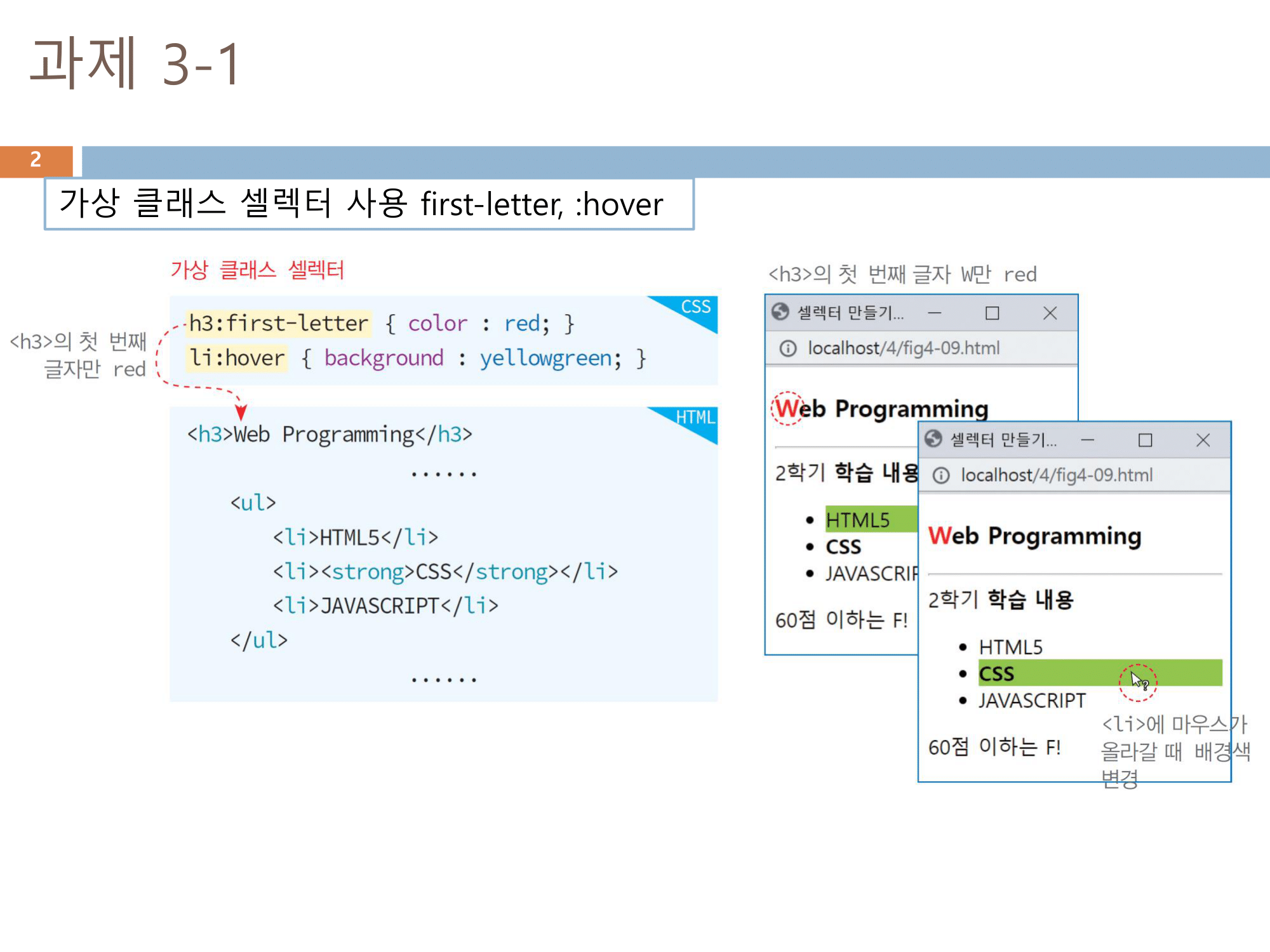h3:first-letter { /* 가상 클래스 셀렉터 */