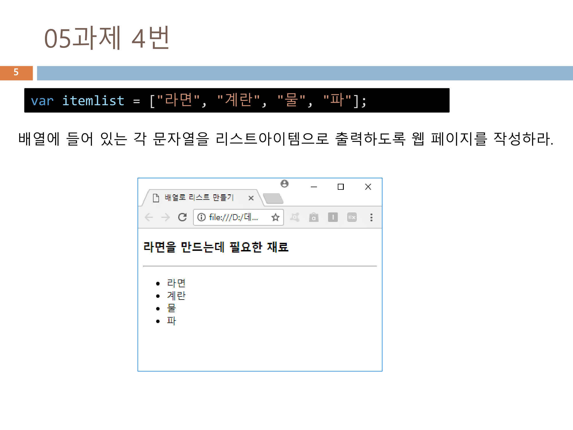 var itemlist = ["라면", "계란", "물", "파"]; // 재료 배열 생성